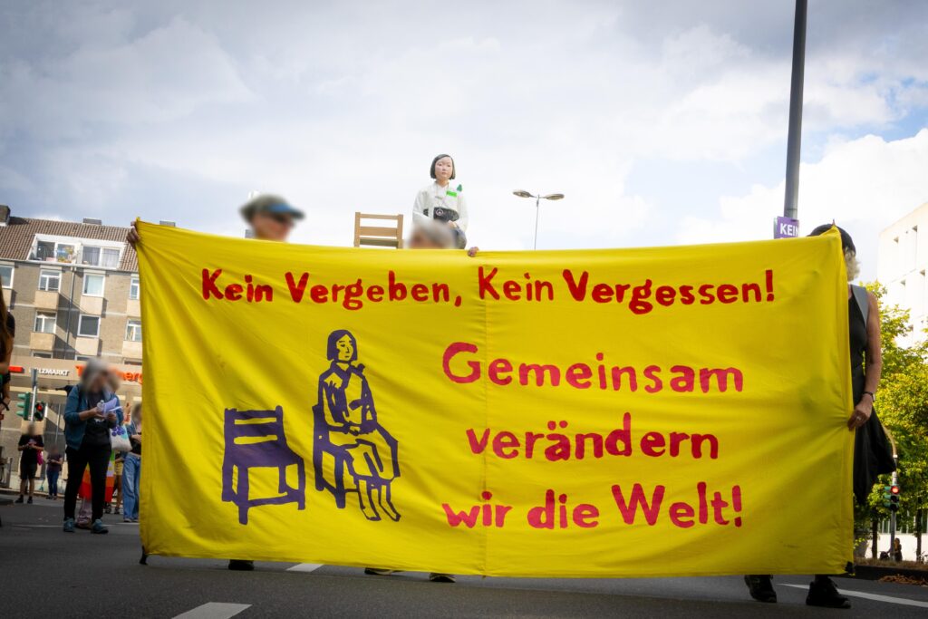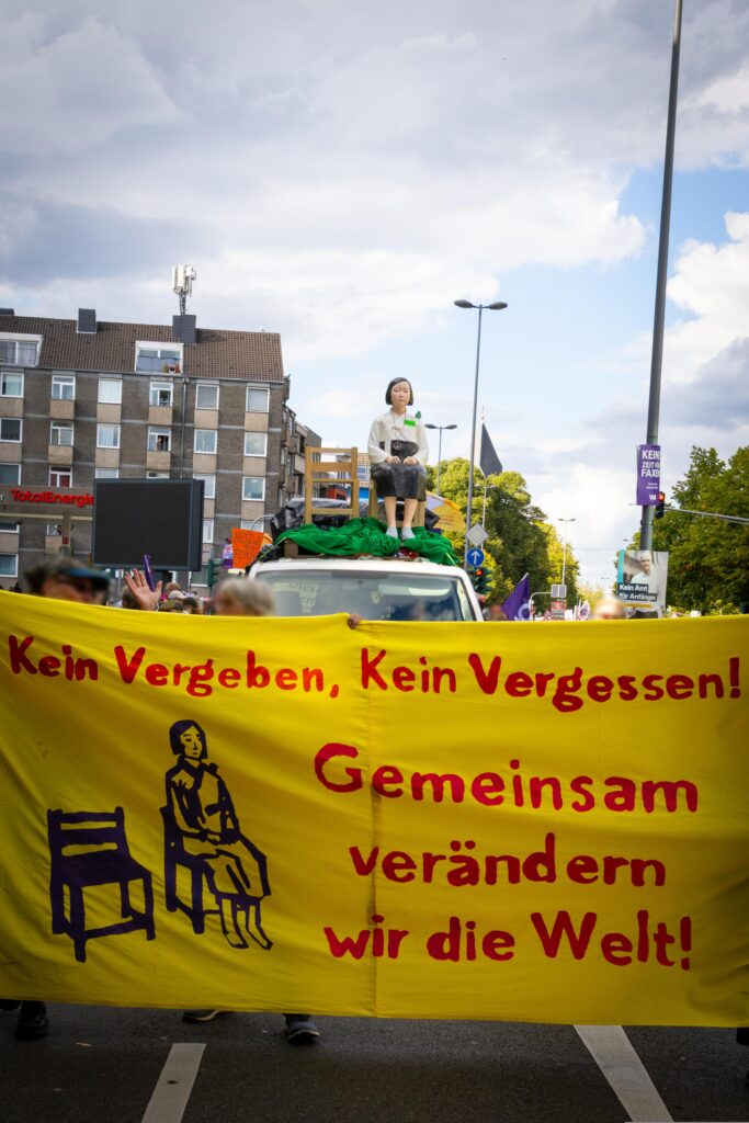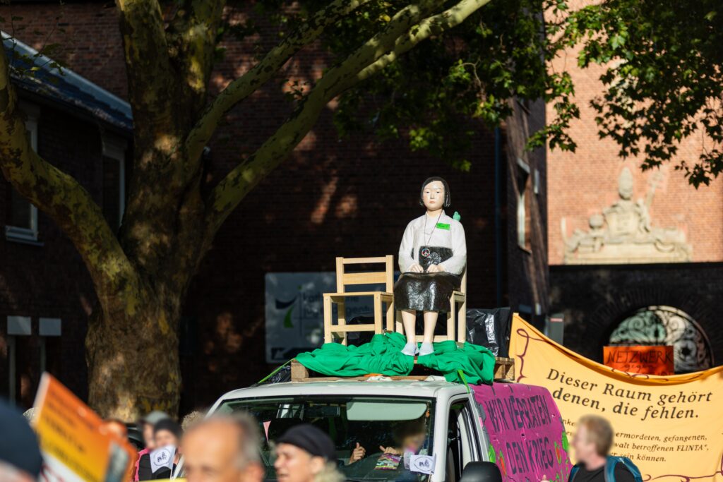 Für Frauen und queere Menschen gibt es dagegen weder im Krieg noch im patriarchalen Davor und Danach Schutz und Sicherheit. Der japanische und der deutsche Staat – schon im Faschismus Verbündete – unterdrücken auch 80 Jahre danach gemeinsam anklagende Stimmen der sogenannten Trostfrauen – Hunderttausende Mädchen und Frauen zwischen 11 und 29 Jahren, die während des Zweiten Weltkriegs aus dem gesamten Asien-Pazifik-Raum entführt, in zynisch sogenannte „Troststationen“ verbracht und dort durch das japanische Militär sexuell versklavt wurden, bis hin zum Tod. Die immer noch allgegenwärtige sexualisierte Gewalt in Kriegen und der Einsatz als strategische Waffe soll unsichtbar bleiben. Den von südkoreanischen Überlebenden initiierten Friedensstatuen der „Trostfrauen“, die genau das anprangern, wird sowohl von Japan wie auch der BRD der öffentliche Raum als Gedenkort verwehrt.