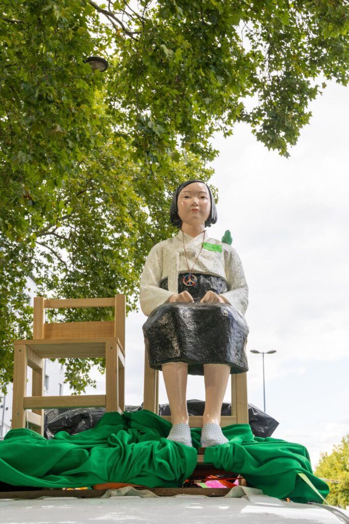 Die Friedenstatue erinnert (und mahnt) an die Opfer systematischer Entführungen und sexueller Sklaverei durch die japanische Armee im Zweiten Weltkrieg. Bis heute wird der Statue ein bleibender Ort der Erinnerung durch die postfaschistischen Nationalstaaten Japan und Deutschland verweigert.