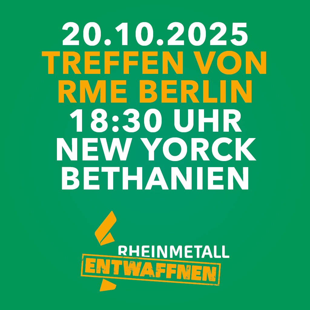 Am Montag, den 20. Oktober um 18:30 in Berlin-Kreuzberg. Wir wollen unter anderem die These „Der Hauptfeind steht im eigenen Land“ und ihre aktuelle Bedeutung diskutieren. Außerdem Folgendes steht auf dem Programm: Wie geht es weiter mit dem Berliner Bündnis gegen Waffenproduktion. Wie geht es weiter mit dem bundesweiten Rheinmetall-Entwaffnen-Bündnis? Machen wir nächstes Jahr wieder ein Camp mit Aktionswoche? Und wo wollen wir als Berliner Ortsgruppe in den zukünftigen Monaten hin?