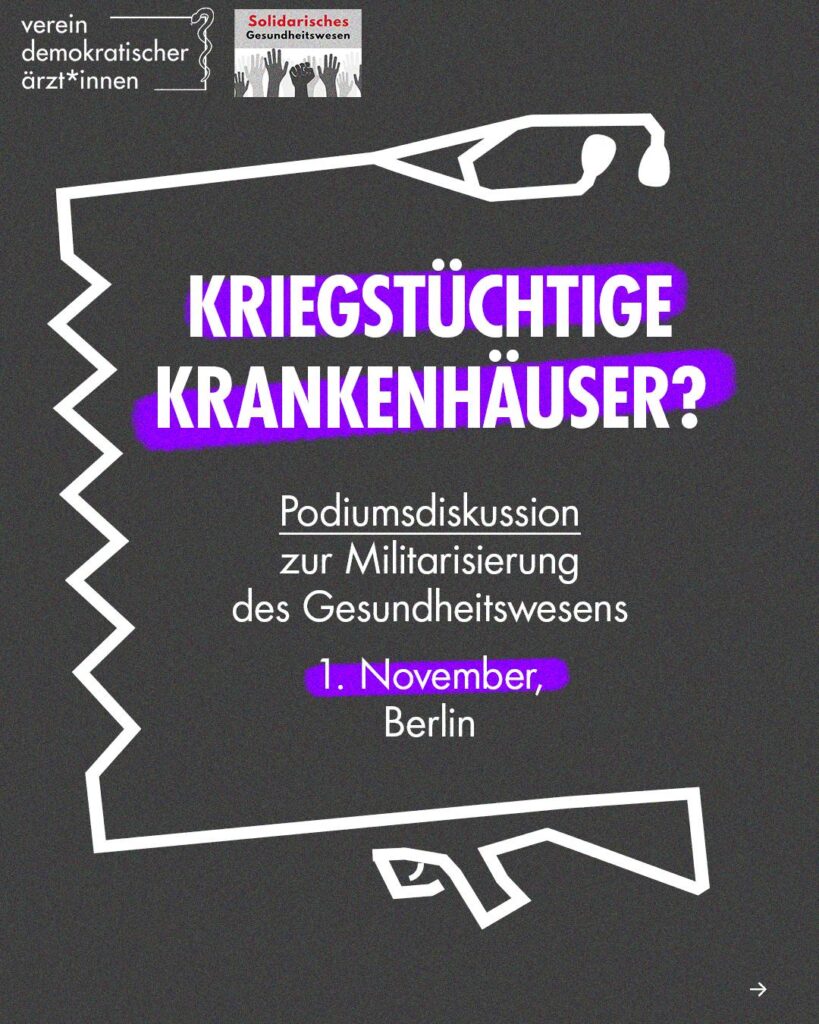 Die Regierung ruft die Kriegstüchtigkeit der Gesellschaft aus. Unser Gesundheitswesen Gesundheitssystem soll im Sinne einer „zivil-militärischen Zusammenarbeit“ auf Kriege vorbereitet werden. Dringend benötigte Ressourcen, die im Gesundheitswesen und sozial-ökologischen Bereich fehlen, fließen in den Aufbau militärischer Strukturen.